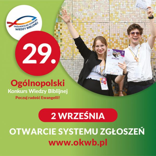 Od dziś tj. 2 września 2024 r. możliwa jest rejestracja do 29. edycji Ogólnopolskiego Konkursu Wiedzy Biblijnej. Zgłoszenia szkoły może dokonać katecheta za pośrednictwem formularza online dostępnego na stronie www.okwb.pl po kliknięciu kafelka ,,ZGŁOŚ SZKOŁĘ”. Rejestracja otwarta do 7 lutego 2025 r.