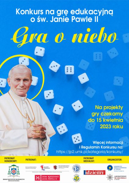 Laboratorium św. Jana Pawła II działające na Uniwersytecie Mikołaja Kopernika w Toruniu zaprasza uczniów szkół ponadpodstawowych do wzięcia udziału w ogólnopolskim konkursie na projekt gry planszowej związanej z życiem i dziedzictwem Papieża Polaka.